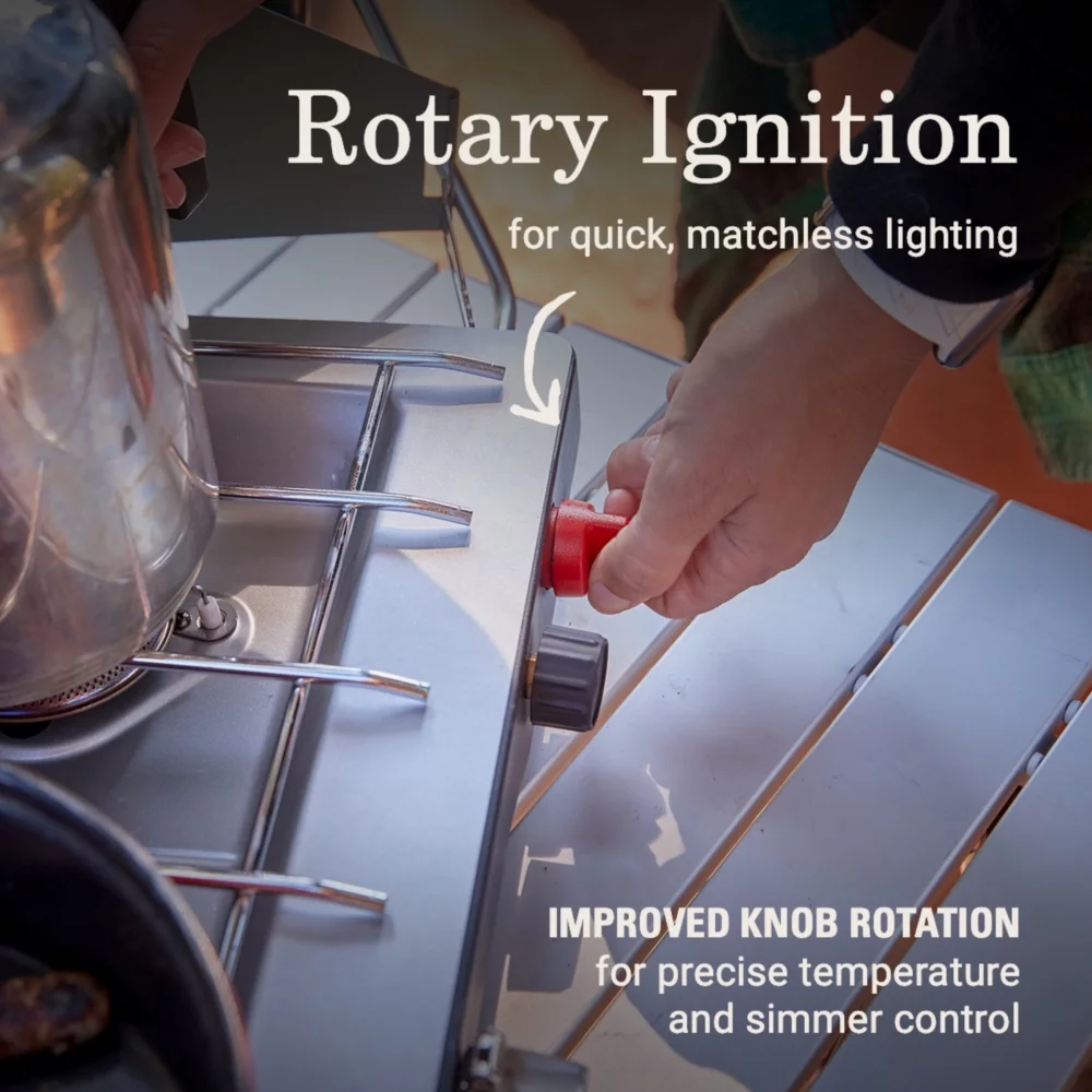- IMPROVED COOKING CONTROL: Improved knob rotation for precise temperature and simmer control of 2 adjustable burners; rotary ignition for quick, matchless lighting