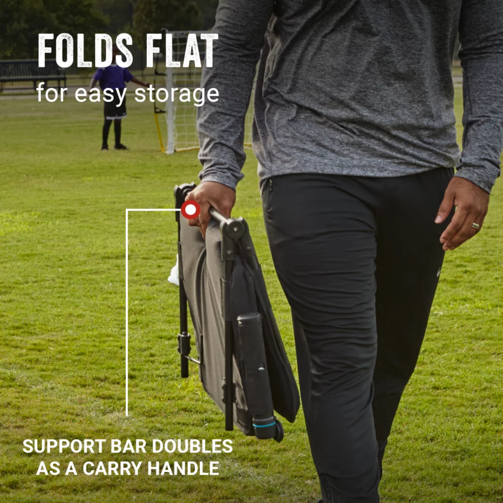- Seat folds in half for easy storage; back metal support bar can double as a carry handle to the bleachers or sidelines